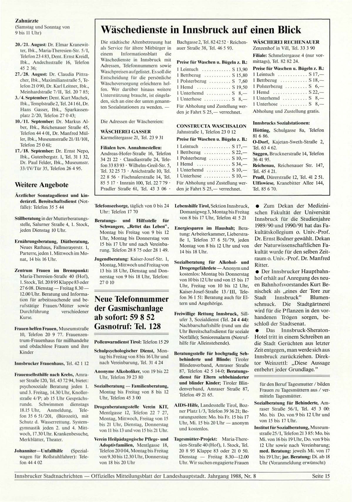 Innsbrucker Stadtnachrichten — Offizielles Mitteilungsblatt der Landeshauptstadt. Jahrgang 1988, Nr. 8