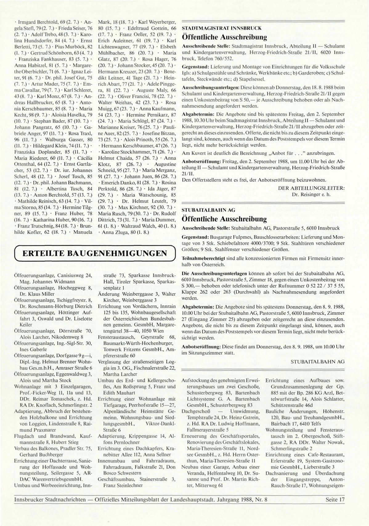 Innsbrucker Stadtnachrichten — Offizielles Mitteilungsblatt der Landeshauptstadt. Jahrgang 1988, Nr. 8