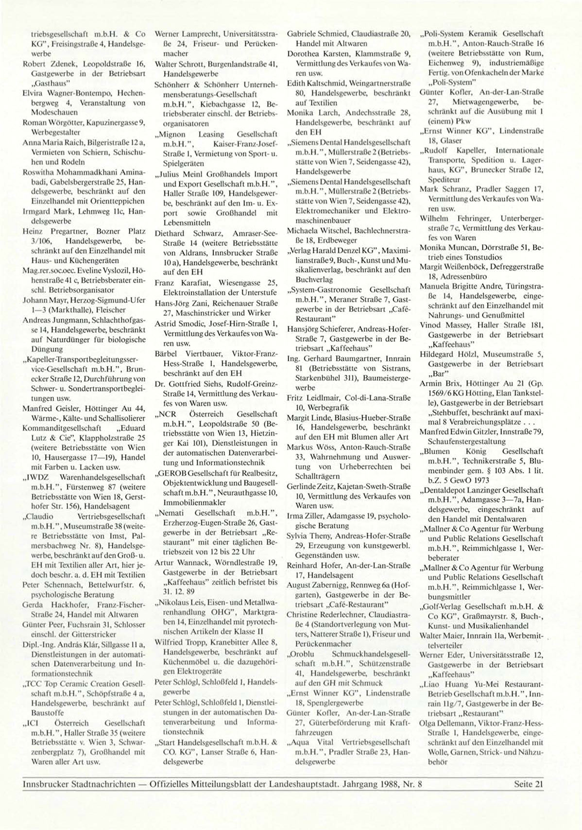 m.b.H.", Meraner Straße 7, GastJohann Mayr, Herzog-Sigmund-Ufer Hans-Jörg Zani, Reichenauer Straße