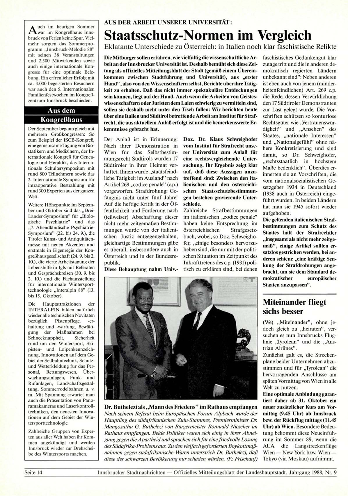 Innsbrucker Stadtnachrichten — Offizielles Mitteilungsblatt der Landeshauptstadt. Jahrgang 1988, Nr. 9