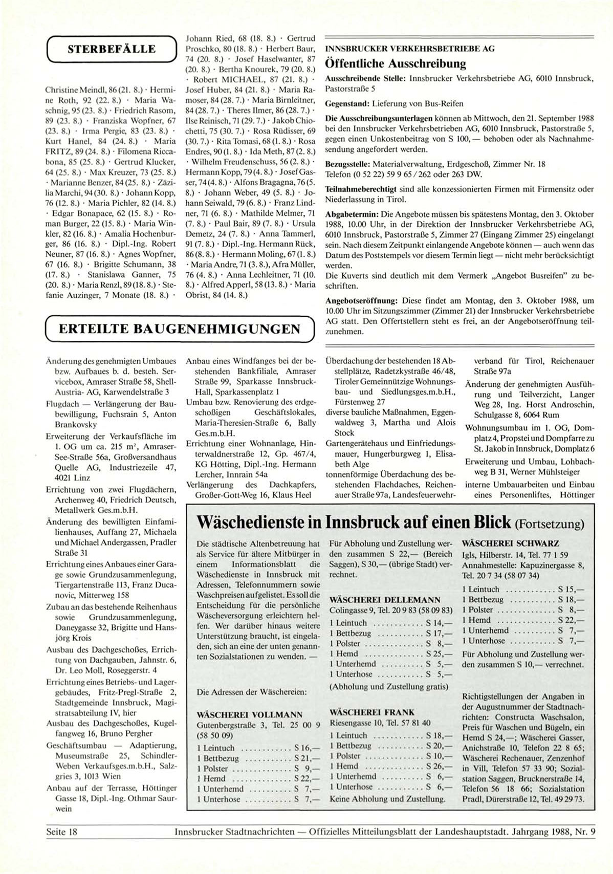 Innsbrucker Stadtnachrichten — Offizielles Mitteilungsblatt der Landeshauptstadt. Jahrgang 1988, Nr. 9