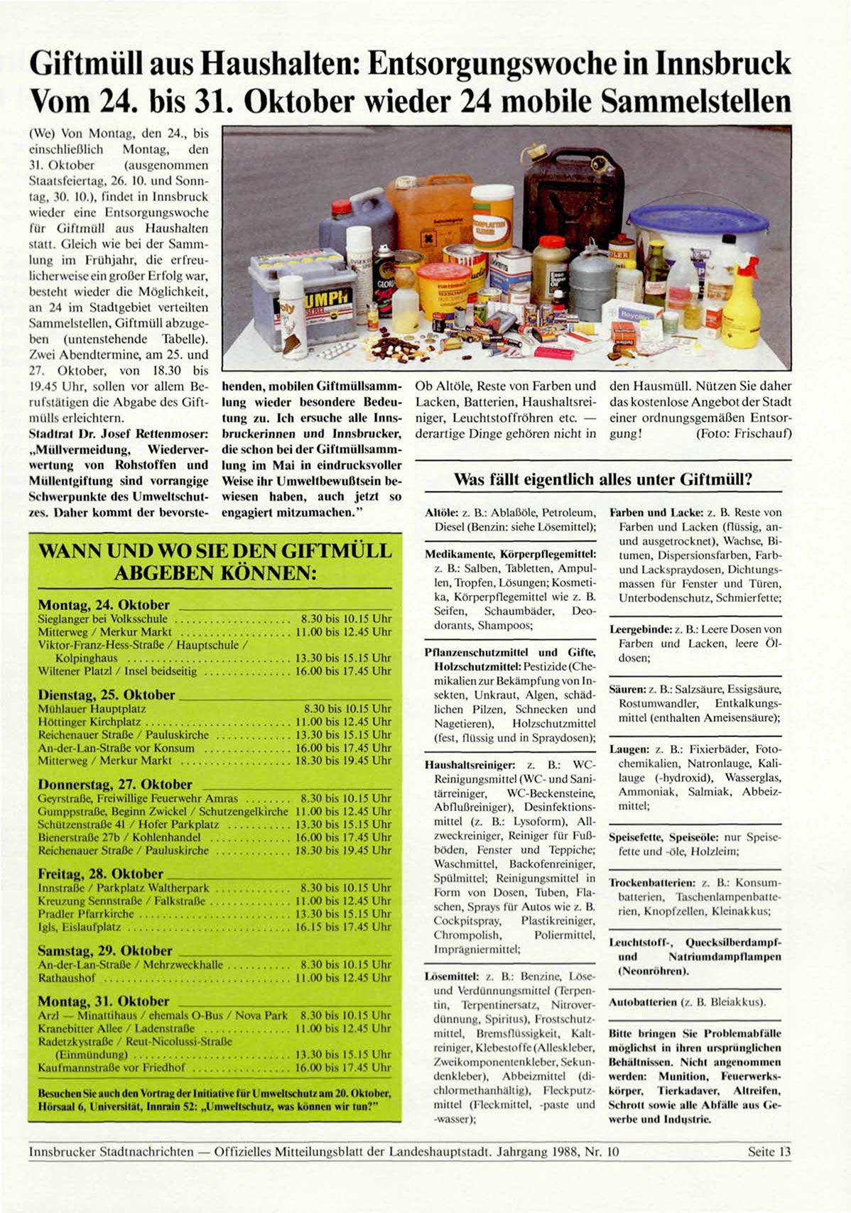 henden, mobilen Giftmiillsammlung wieder besondere Bedeutung zu. Ich ersuche alle Innsbruckerinnen und Innsbrucker,