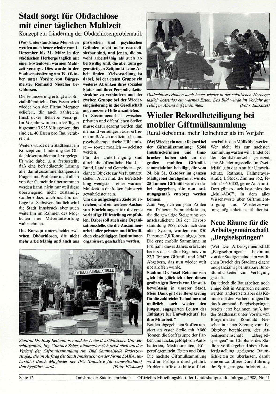 Innsbrucker Stadtnachrichten — Offizielles Mitteilungsblatt der Landeshauptstadt. Jahrgang 1988, Nr. 11