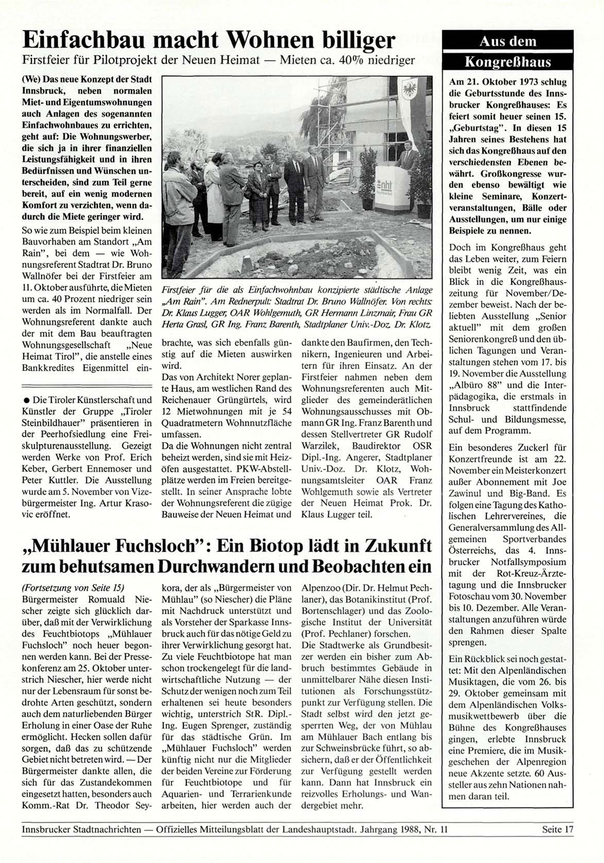 Blick in die KongreßhausFirstfeier für die als Einfachwohnbau konzipierte städtische Anlage zeitung für November/De„Am Rain". Am Rednerpult: Stadtrat Dr. Bruno Wallnöfer. Von rechts:zember beweist. Nach der beDr. Klaus Lugger, OAR Wohlgemuth, GR Hermann Linzmair, Frau GR liebten Ausstellung „Senior