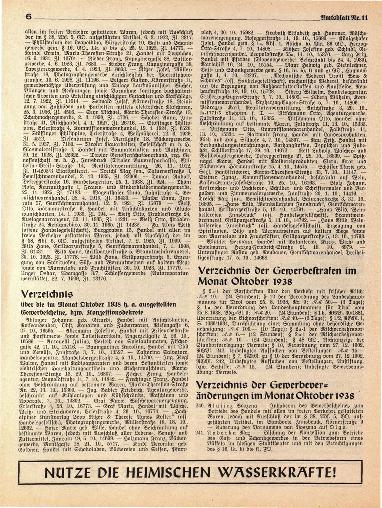 Verzeichnis der 6ewerbeveranderungen im klonat Oktober 1938