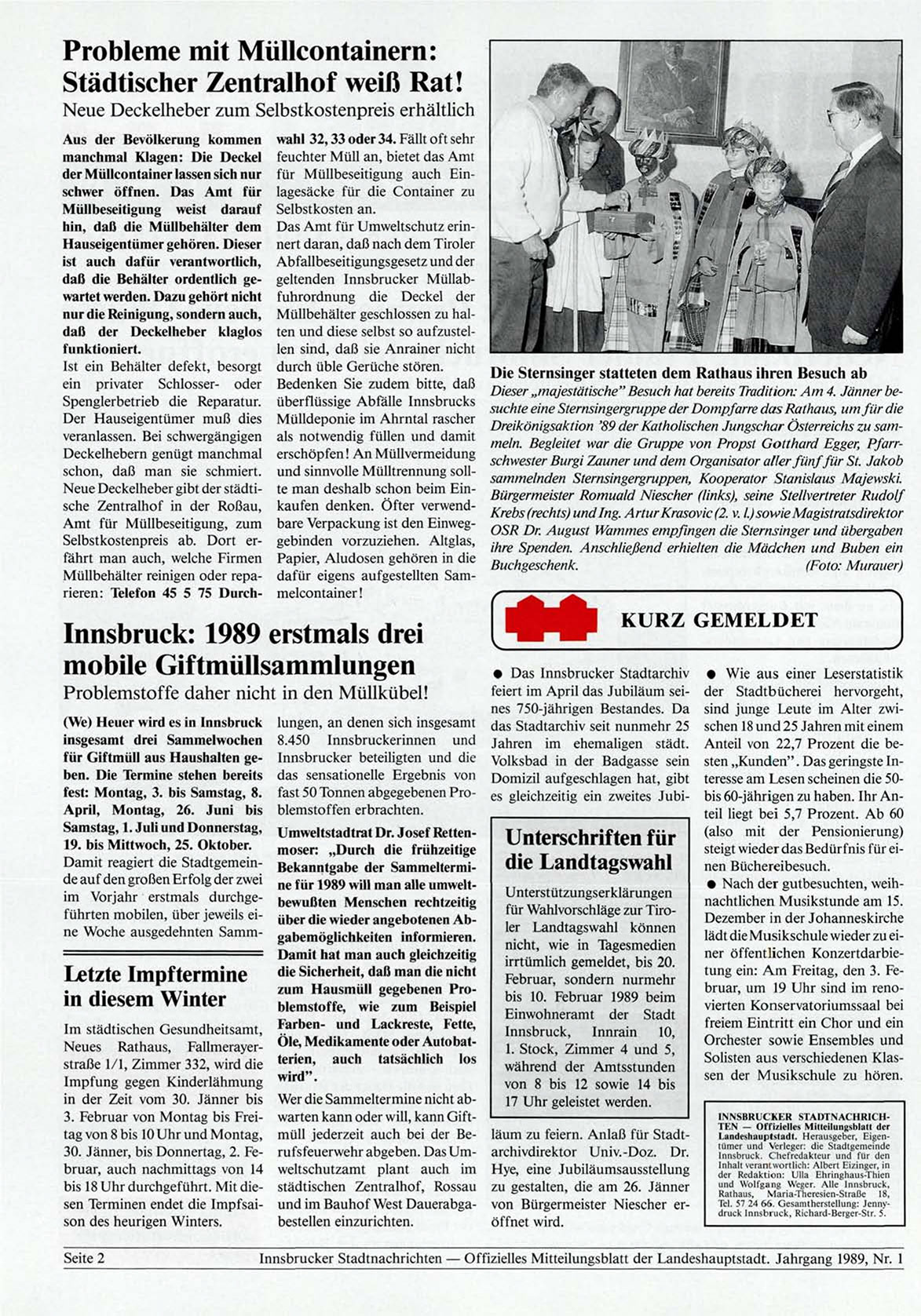 Innsbrucker Stadtnachrichten — Offizielles Mitteilungsblatt der Landeshauptstadt. Jahrgang 1989, Nr. 1
