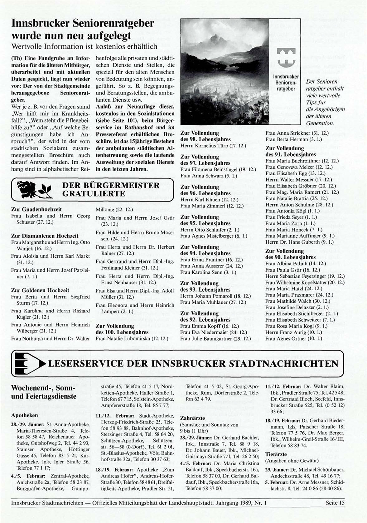 Innsbrucker Stadtnachrichten — Offizielles Mitteilungsblatt der Landeshauptstadt. Jahrgang 1989, Nr. 1