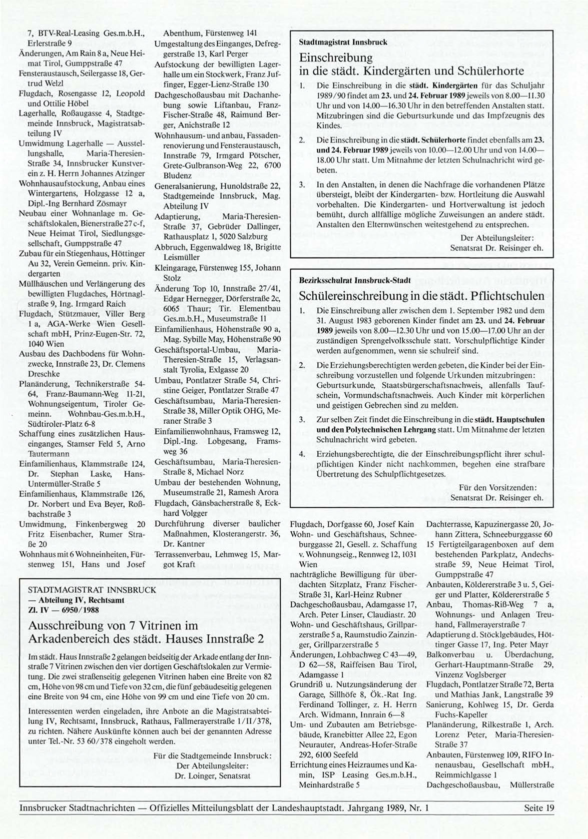Innsbrucker Stadtnachrichten — Offizielles Mitteilungsblatt der Landeshauptstadt. Jahrgang 1989, Nr. 1