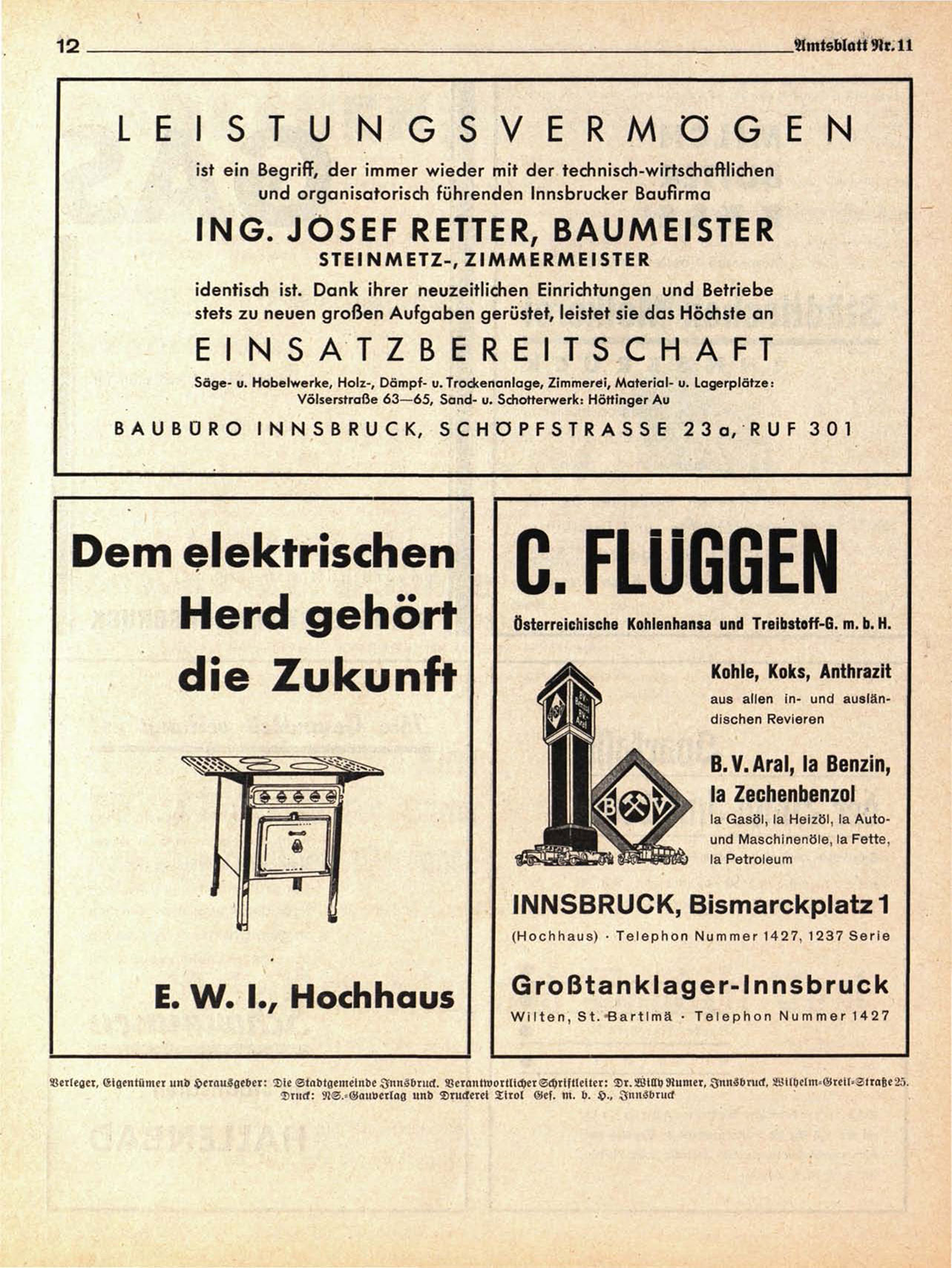 Verleger, Eigentümer und Herausgeber: Die Stadtgemelnde Innsbruck. Verantwortlicher Schriftleiter: Dr. Willy Rumer, Innsbruck. Wilhelm-Greil°Straße25.