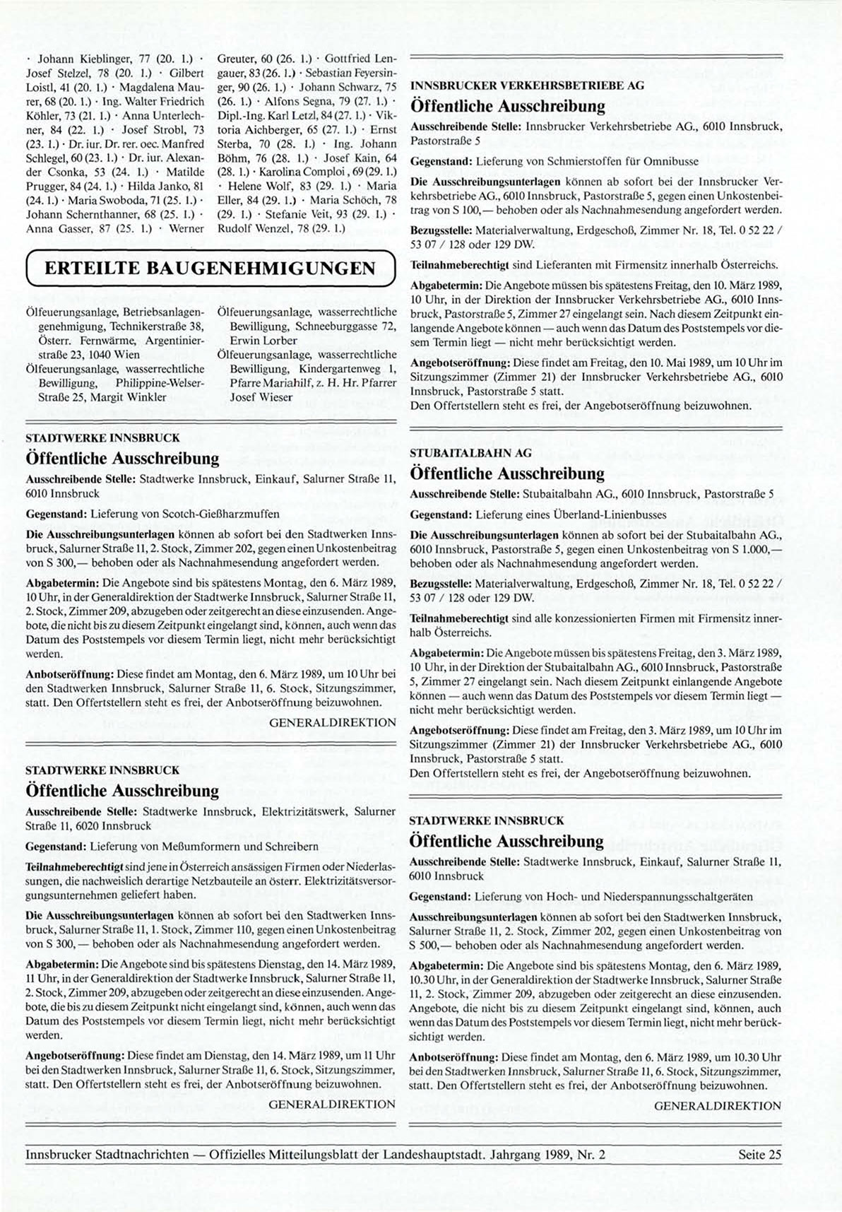 Innsbrucker Stadtnachrichten — Offizielles Mitteilungsblatt der Landeshauptstadt. Jahrgang 1989, Nr. 2