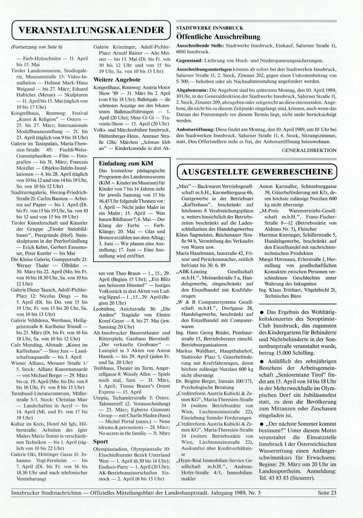 Innsbrucker Stadtnachrichten — Offizielles Mitteilungsblatt der Landeshauptstadt. Jahrgang 1989, Nr. 3