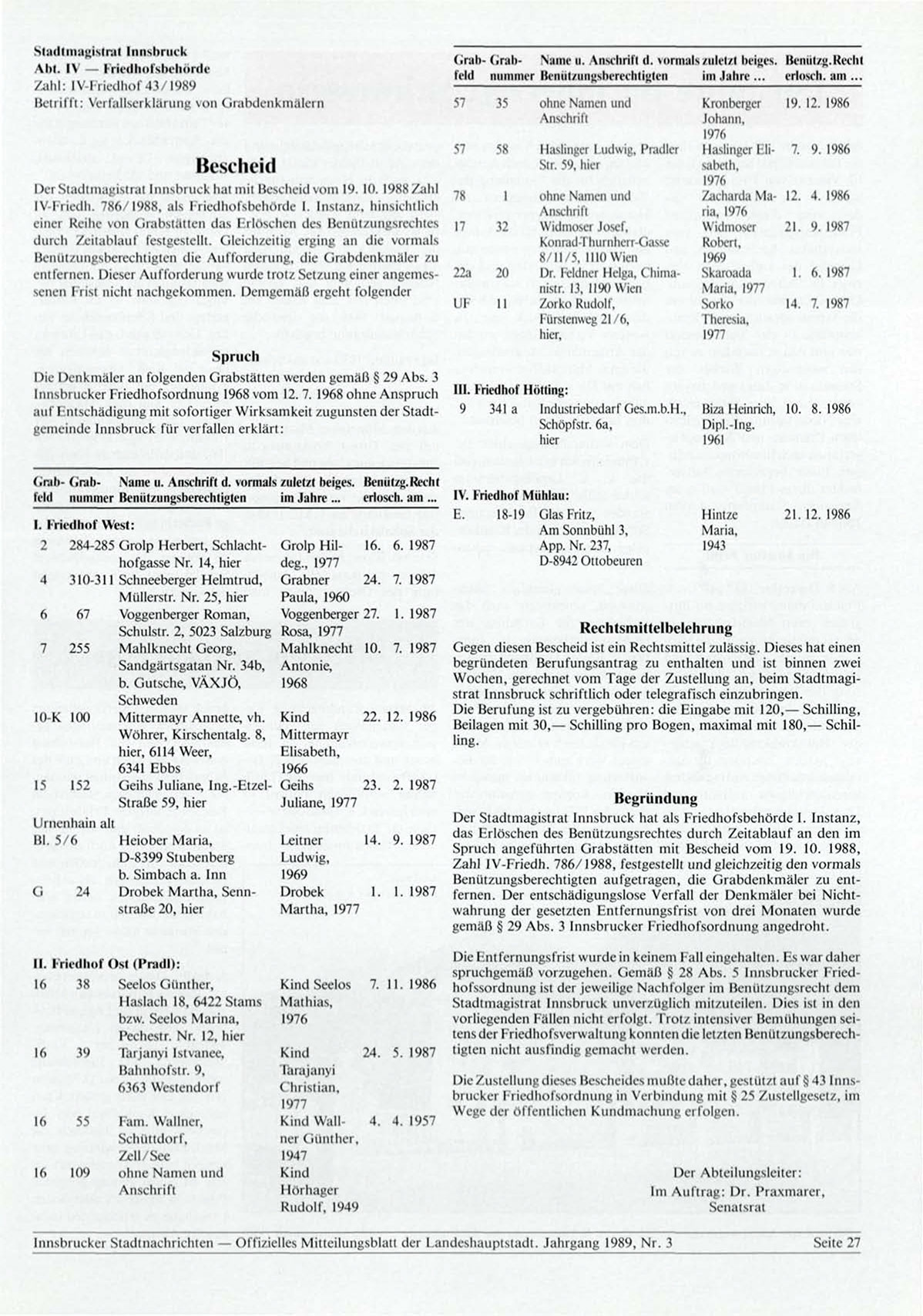 Benützungsberechtigten aufgetragen, die Grabdenkmäler zu entfernen. Der entschädigungslose Verfall der Denkmäler bei Nichtwahrung der gesetzten Entfernungsfrist von drei Monaten wurde