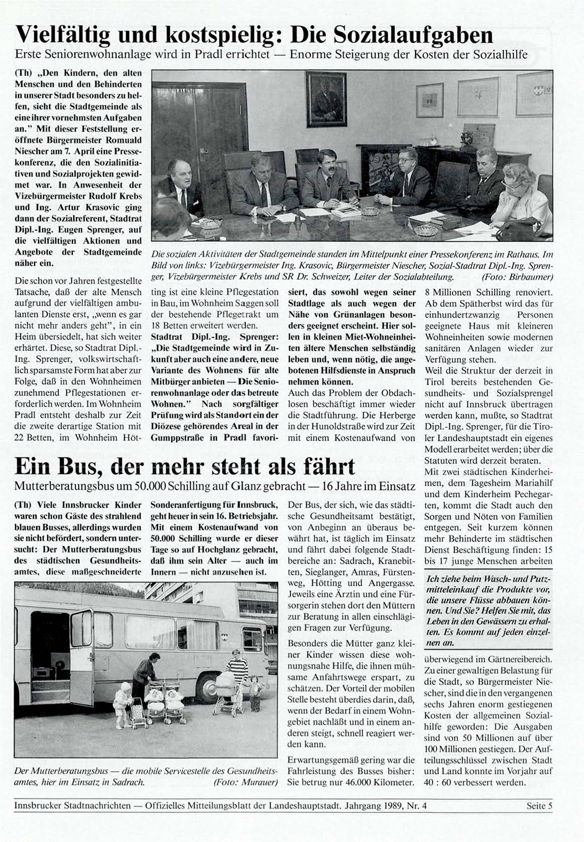 Innsbrucker Stadtnachrichten — Offizielles Mitteilungsblatt der Landeshauptstadt. Jahrgang 1989, Nr. 4