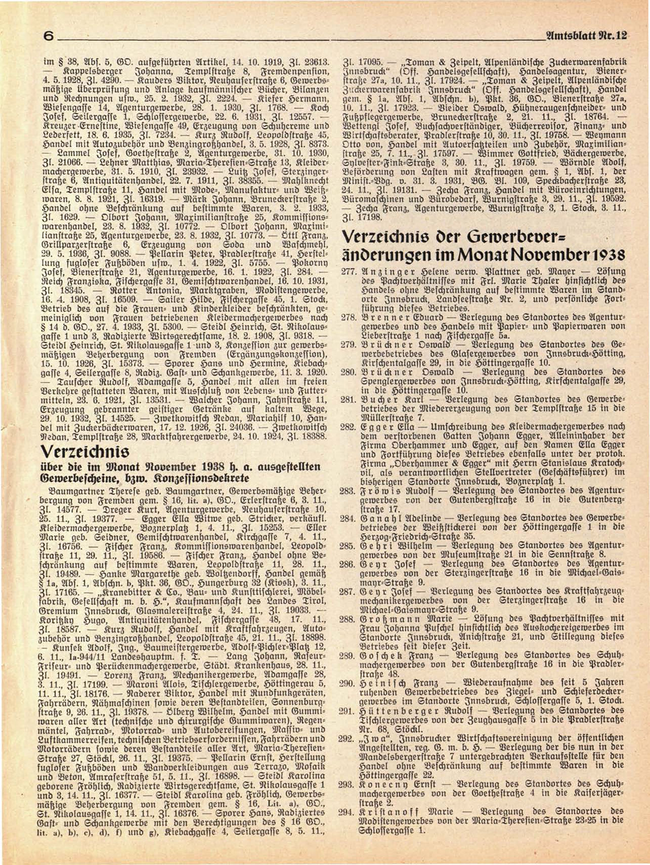 stratze 11. 29. 11.. I I . 19586. — Fischer Franz. Handel ohne Beschränkung auf bestimmte Waren. Leopoldstratze 11, 28. 11., 286. G e y r Josef — Verlegung des Standortes des Agenturgewerbes von der Sterzingerstraße 16 in die Michael-GaisI I . 19489. — Hanke Margarethe geb. Woltzendorff, Handel gemäß
