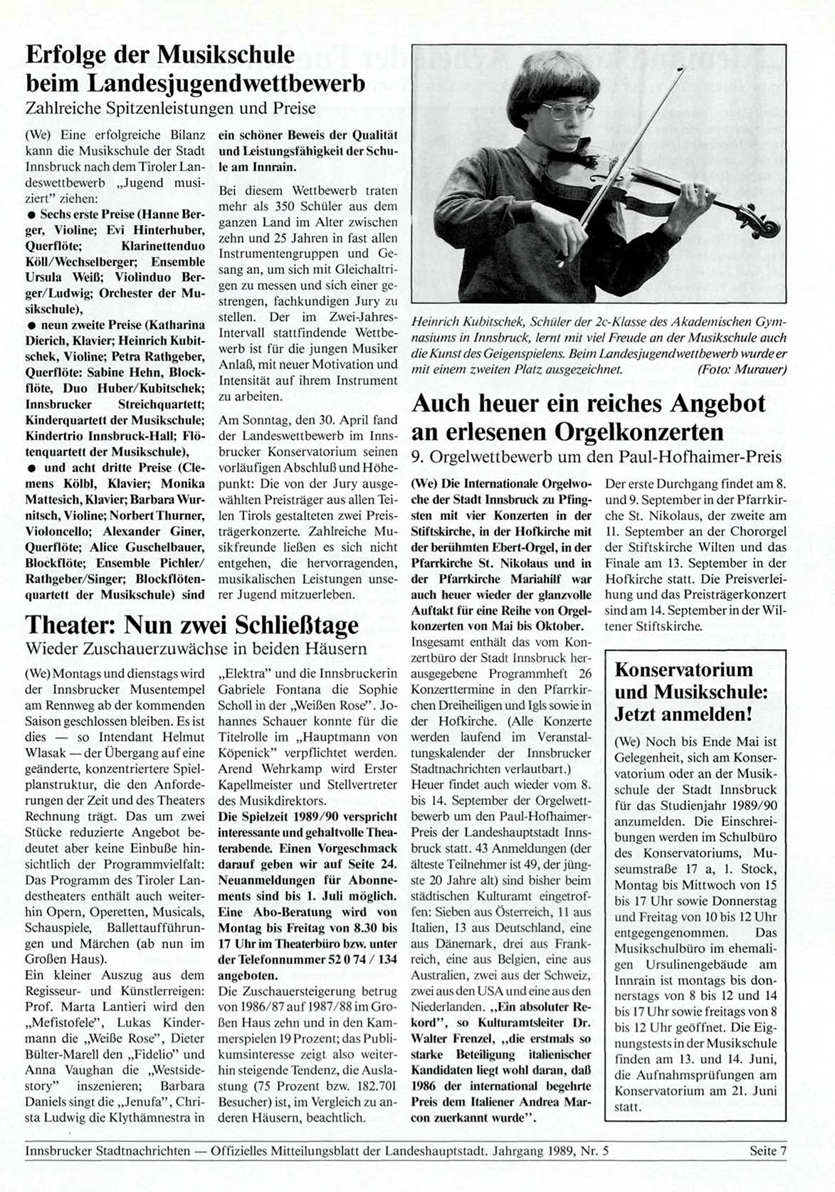 Innsbrucker Stadtnachrichten — Offizielles Mitteilungsblatt der Landeshauptstadt. Jahrgang 1989, Nr. 5