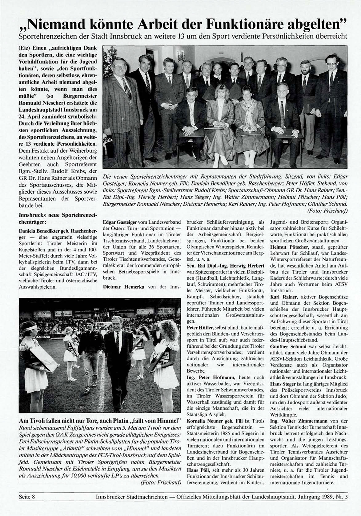 Innsbrucker Stadtnachrichten — Offizielles Mitteilungsblatt der Landeshauptstadt. Jahrgang 1989, Nr. 5