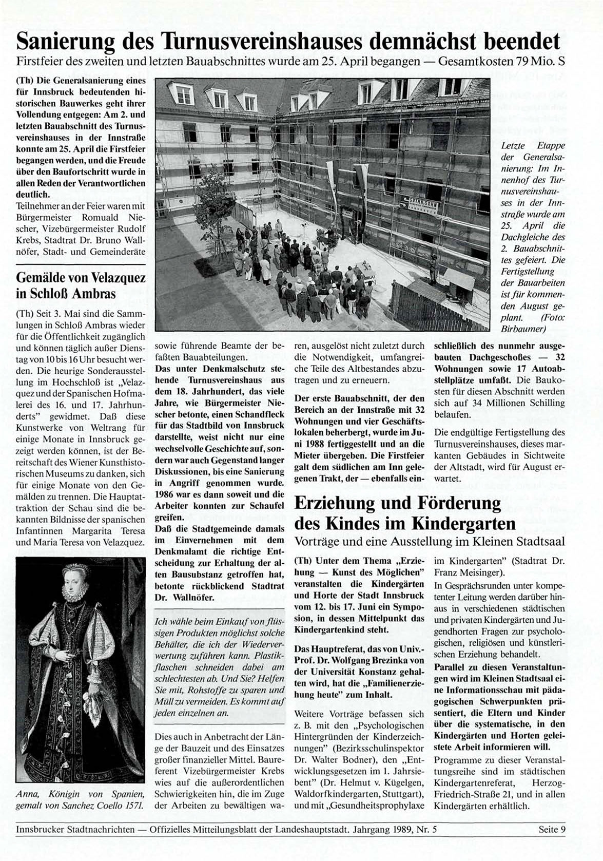 Innsbrucker Stadtnachrichten — Offizielles Mitteilungsblatt der Landeshauptstadt. Jahrgang 1989, Nr. 5