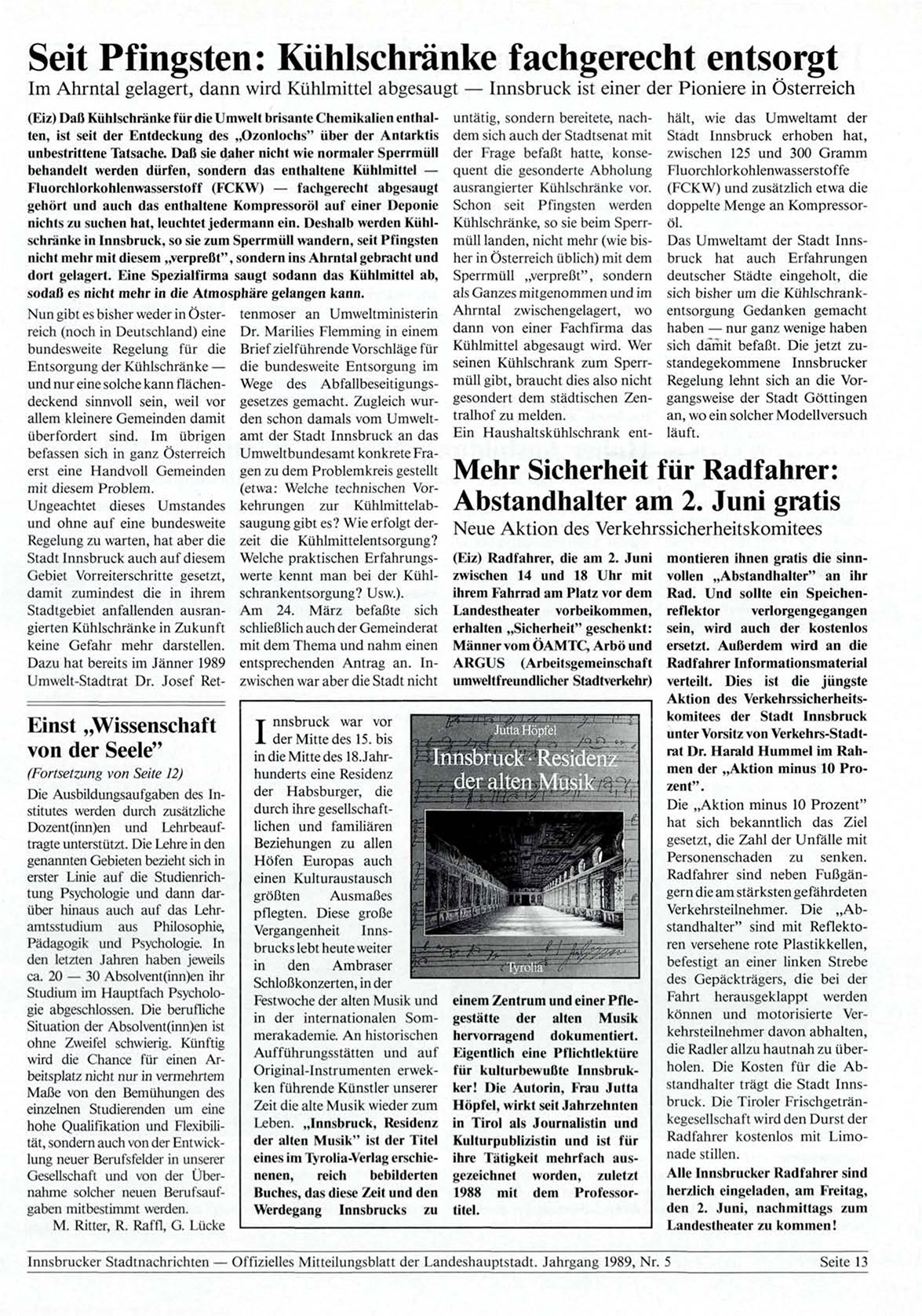 Innsbrucker Stadtnachrichten — Offizielles Mitteilungsblatt der Landeshauptstadt. Jahrgang 1989, Nr. 5