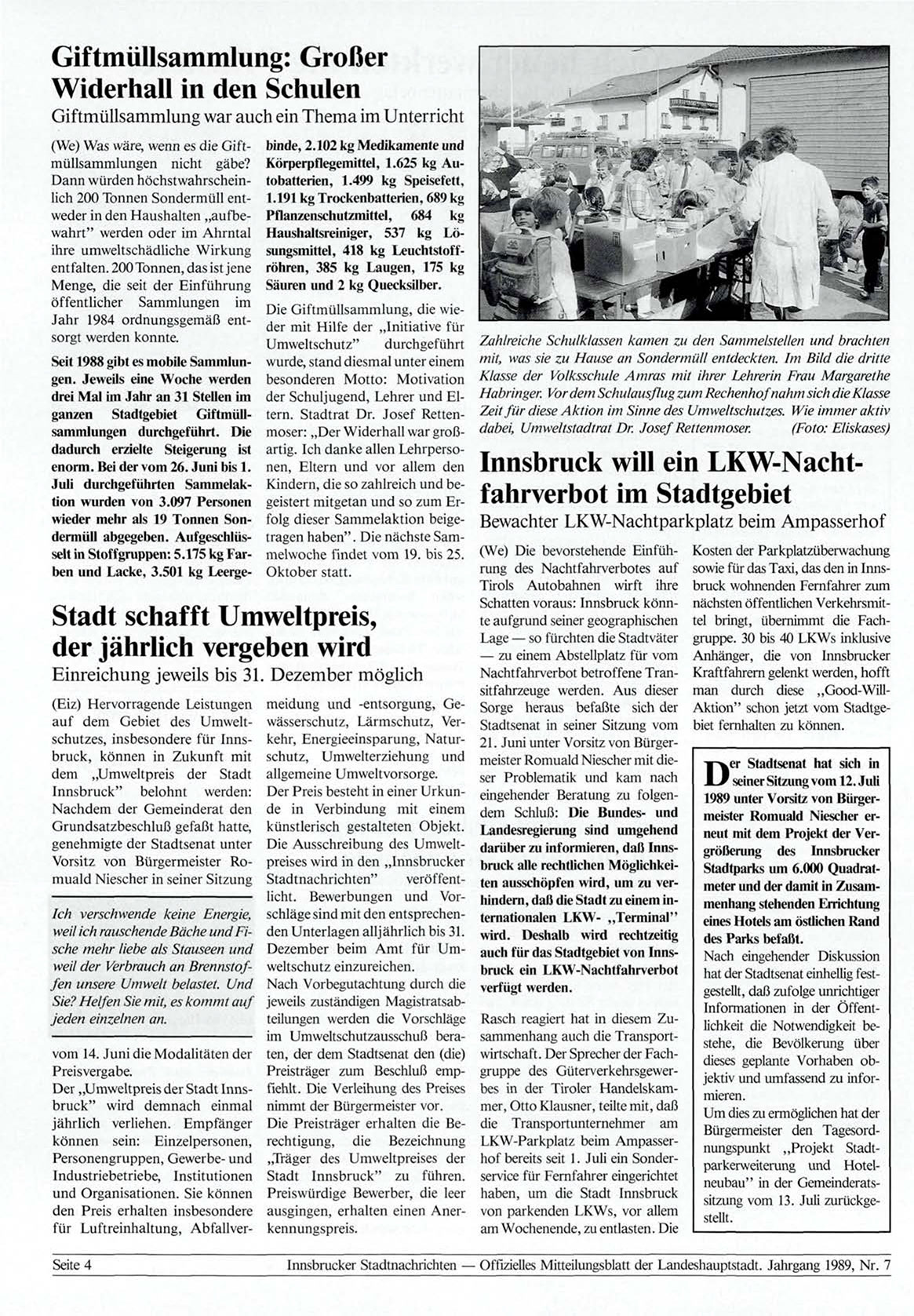 Innsbrucker Stadtnachrichten — Offizielles Mitteilungsblatt der Landeshauptstadt. Jahrgang 1989, Nr. 7