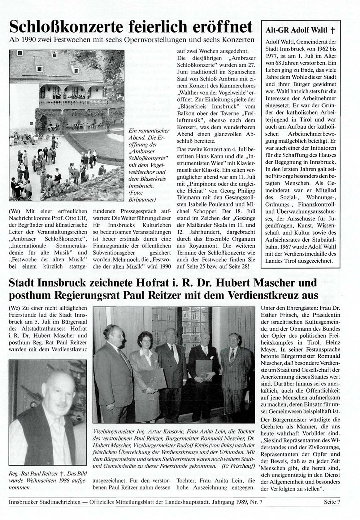 Innsbrucker Stadtnachrichten — Offizielles Mitteilungsblatt der Landeshauptstadt. Jahrgang 1989, Nr. 7