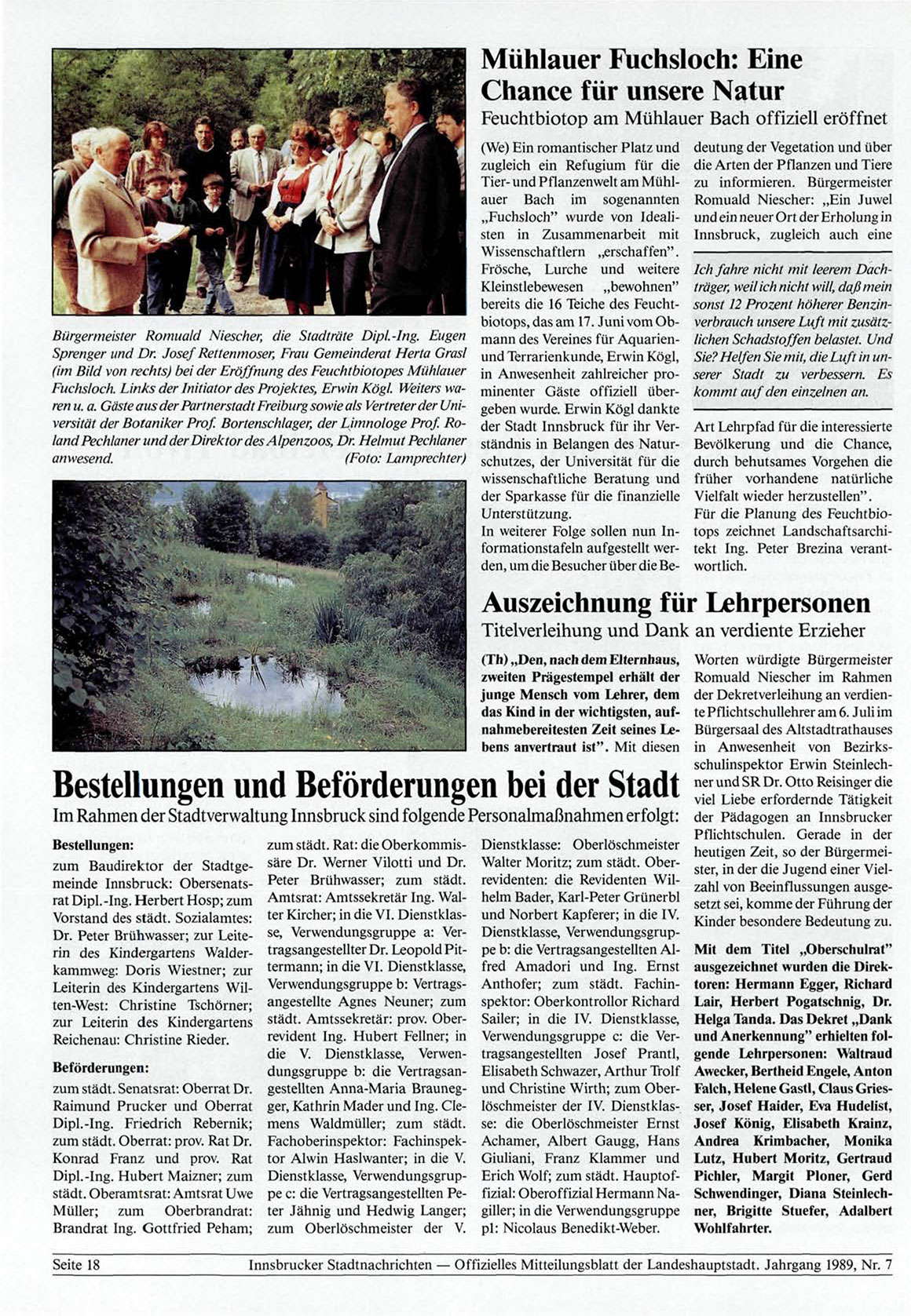 Innsbrucker Stadtnachrichten — Offizielles Mitteilungsblatt der Landeshauptstadt. Jahrgang 1989, Nr. 7