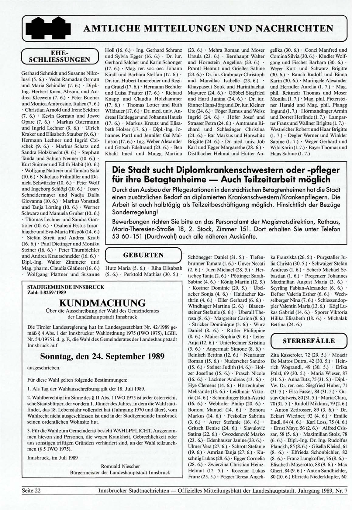 Innsbrucker Stadtnachrichten — Offizielles Mitteilungsblatt der Landeshauptstadt. Jahrgang 1989, Nr. 7