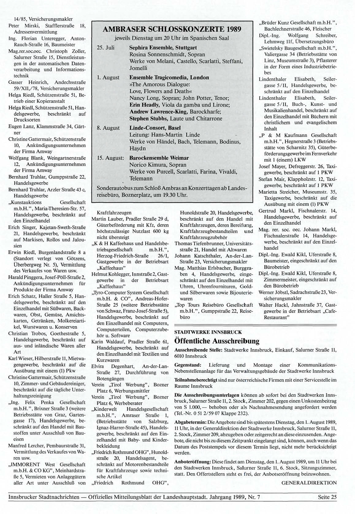 Innsbrucker Stadtnachrichten — Offizielles Mitteilungsblatt der Landeshauptstadt. Jahrgang 1989, Nr. 7