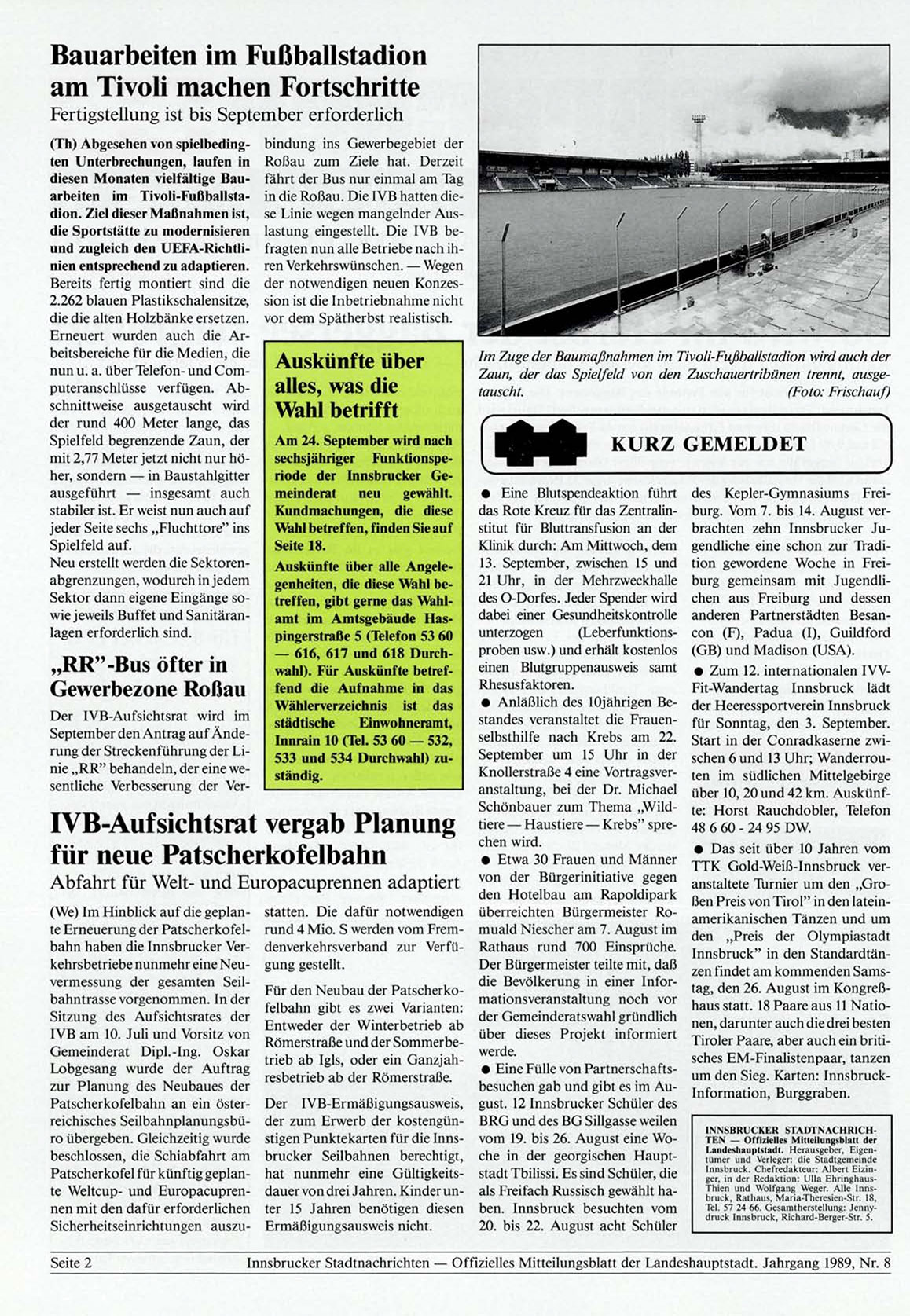 Innsbrucker Stadtnachrichten — Offizielles Mitteilungsblatt der Landeshauptstadt. Jahrgang 1989, Nr. 8