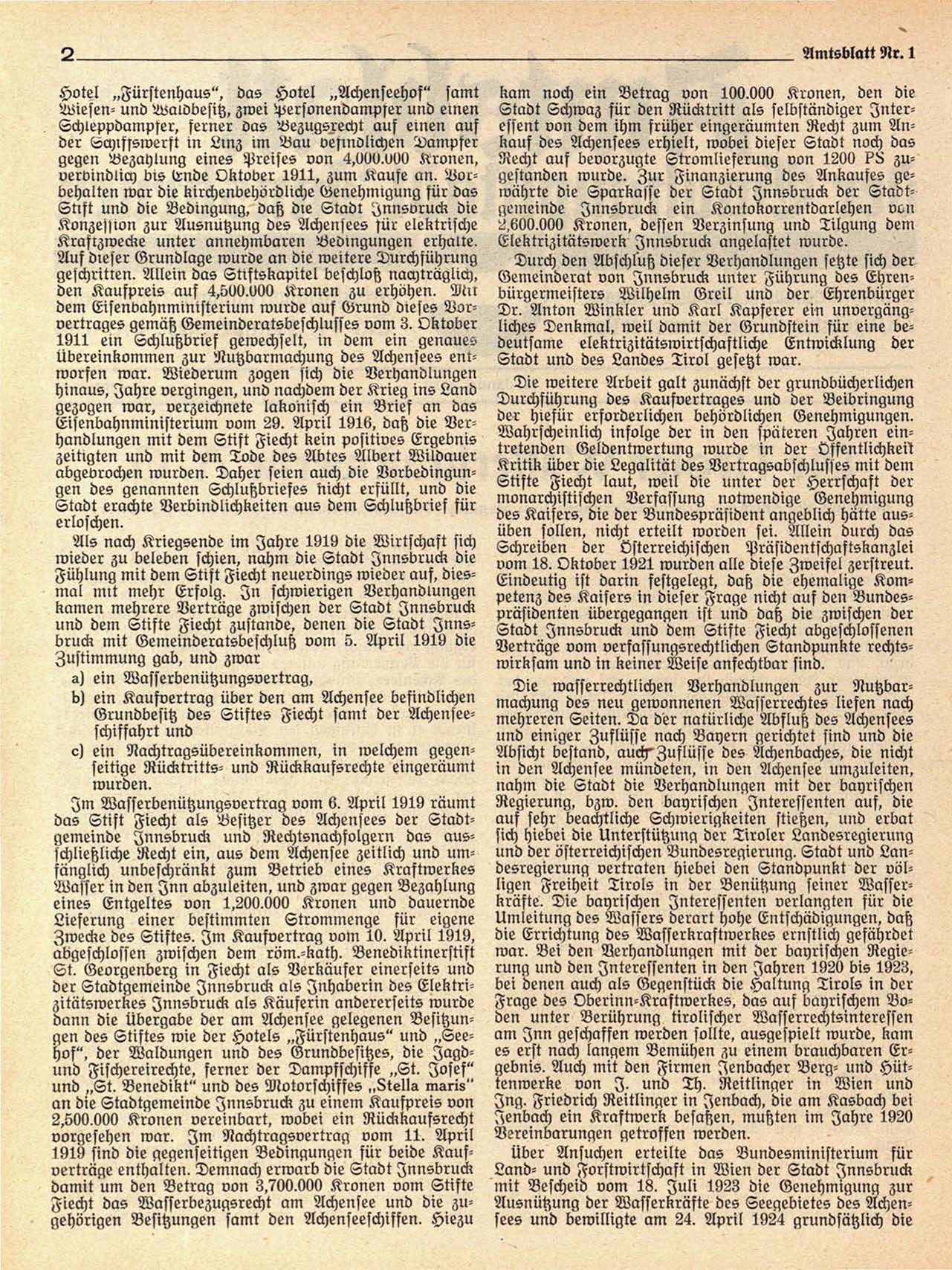 Stadt Schwaz für den Rücktritt als selbständiger Interessent von dem ihm früher eingeräumten Recht zum Ankauf des Achensees erhielt, wobei dieser Stadt noch das