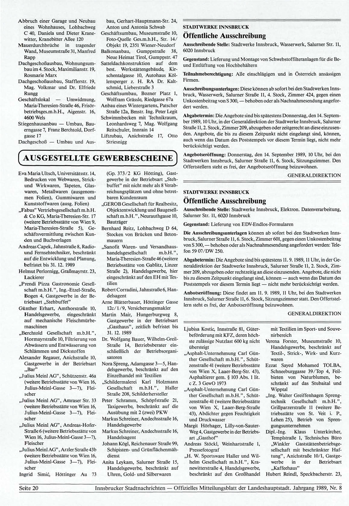 Abgabetermin: Die Angebote sind bis spätestens Donnerstag, den 14. September 1989, 10 Uhr, in der Generaldirektion der Stadtwerke Innsbruck, Salurner