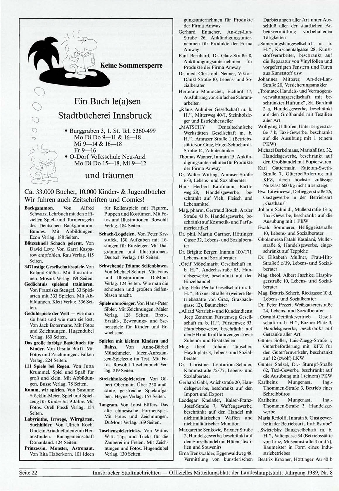 Innsbrucker Stadtnachrichten — Offizielles Mitteilungsblatt der Landeshauptstadt. Jahrgang 1989, Nr. 8