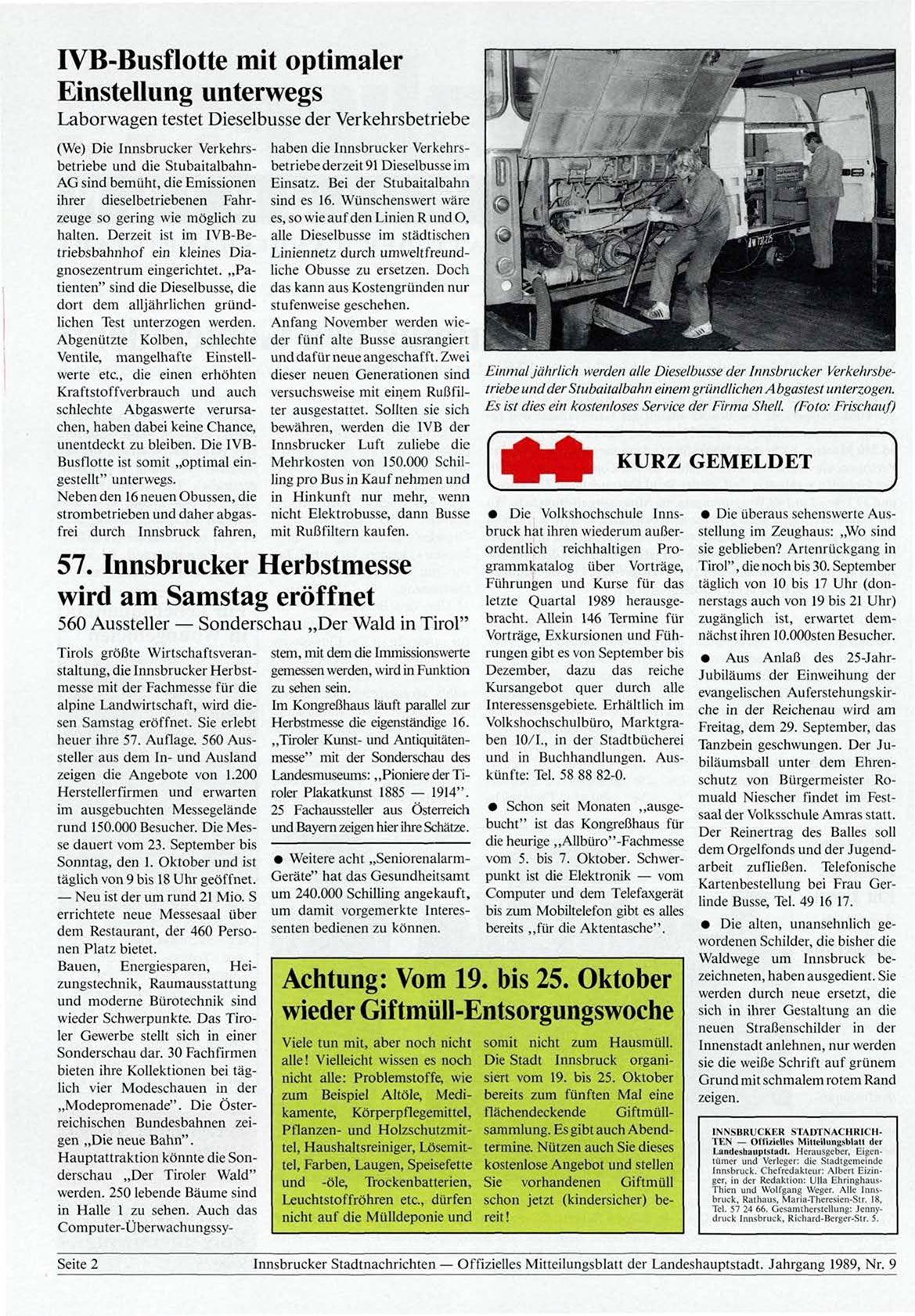 Innsbrucker Stadtnachrichten — Offizielles Mitteilungsblatt der Landeshauptstadt. Jahrgang 1989, Nr. 9
