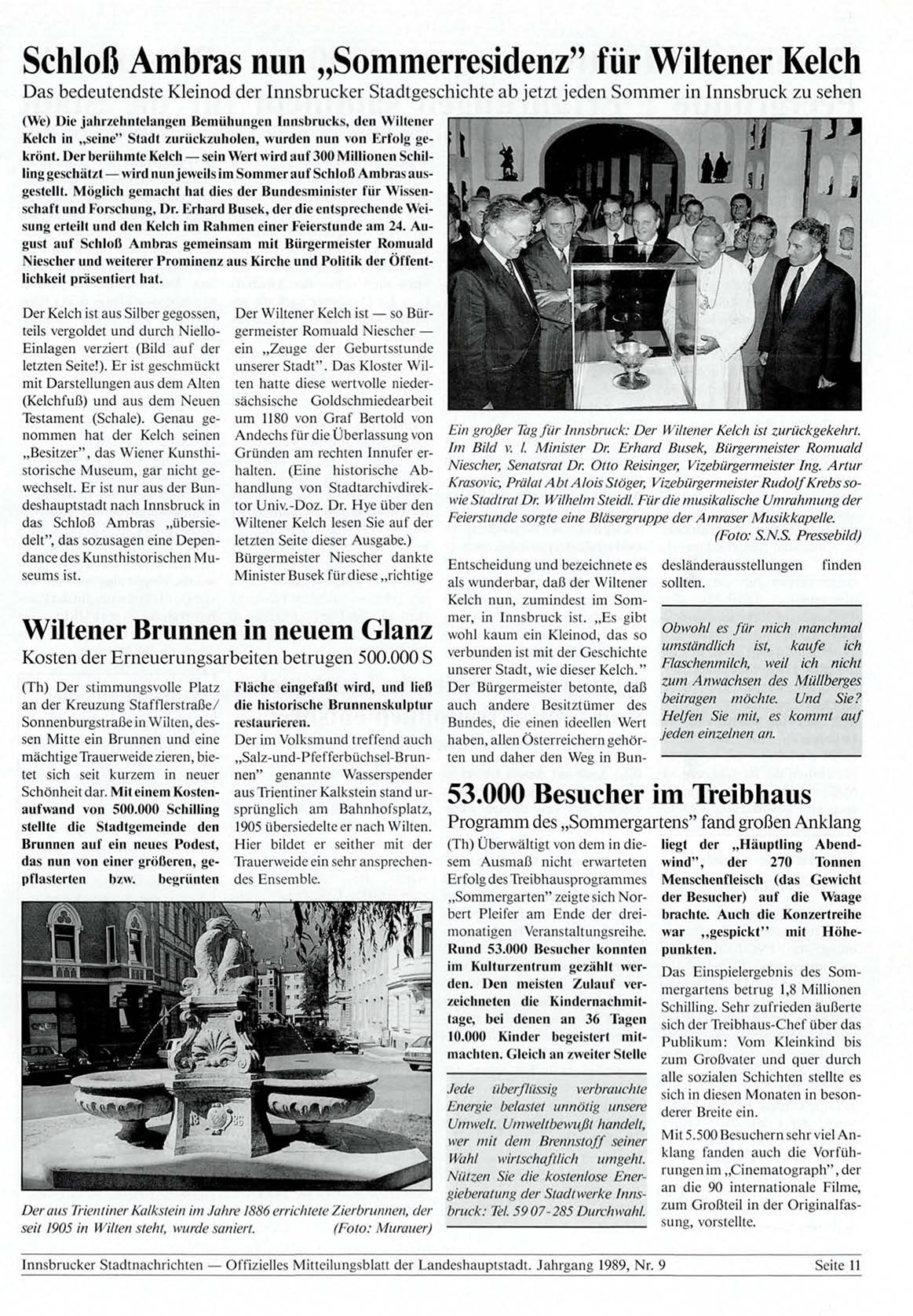 Innsbrucker Stadtnachrichten — Offizielles Mitteilungsblatt der Landeshauptstadt. Jahrgang 1989, Nr. 9