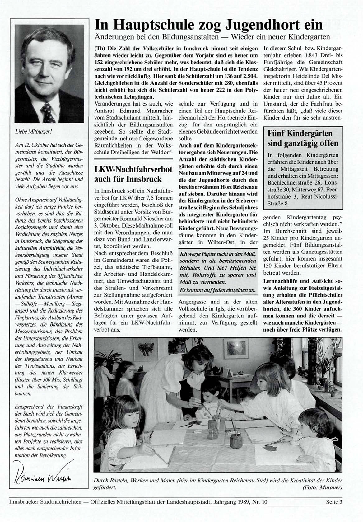 Innsbrucker Stadtnachrichten — Offizielles Mitteilungsblatt der Landeshauptstadt. Jahrgang 1989, Nr. 10