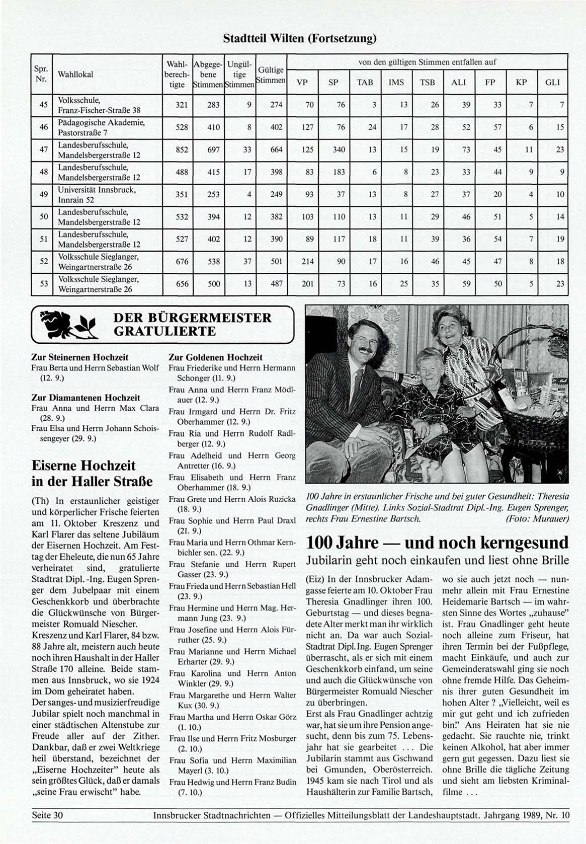 Innsbrucker Stadtnachrichten — Offizielles Mitteilungsblatt der Landeshauptstadt. Jahrgang 1989, Nr. 10