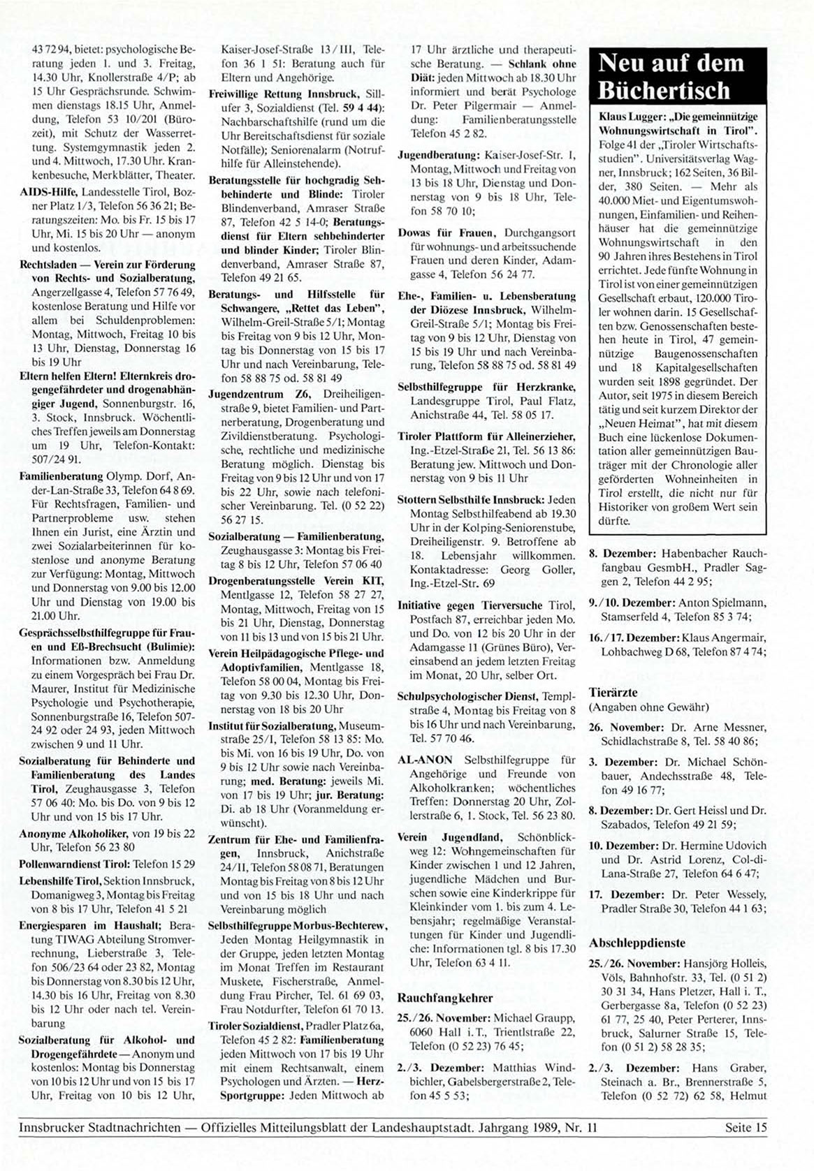 Innsbrucker Stadtnachrichten — Offizielles Mitteilungsblatt der Landeshauptstadt. Jahrgang 1989, Nr. 11
