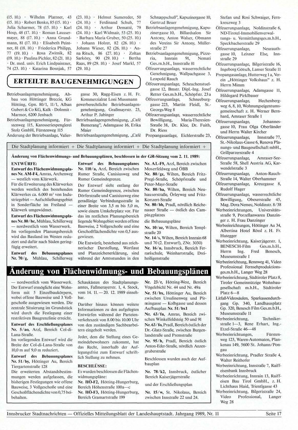 Innsbrucker Stadtnachrichten — Offizielles Mitteilungsblatt der Landeshauptstadt. Jahrgang 1989, Nr. 11