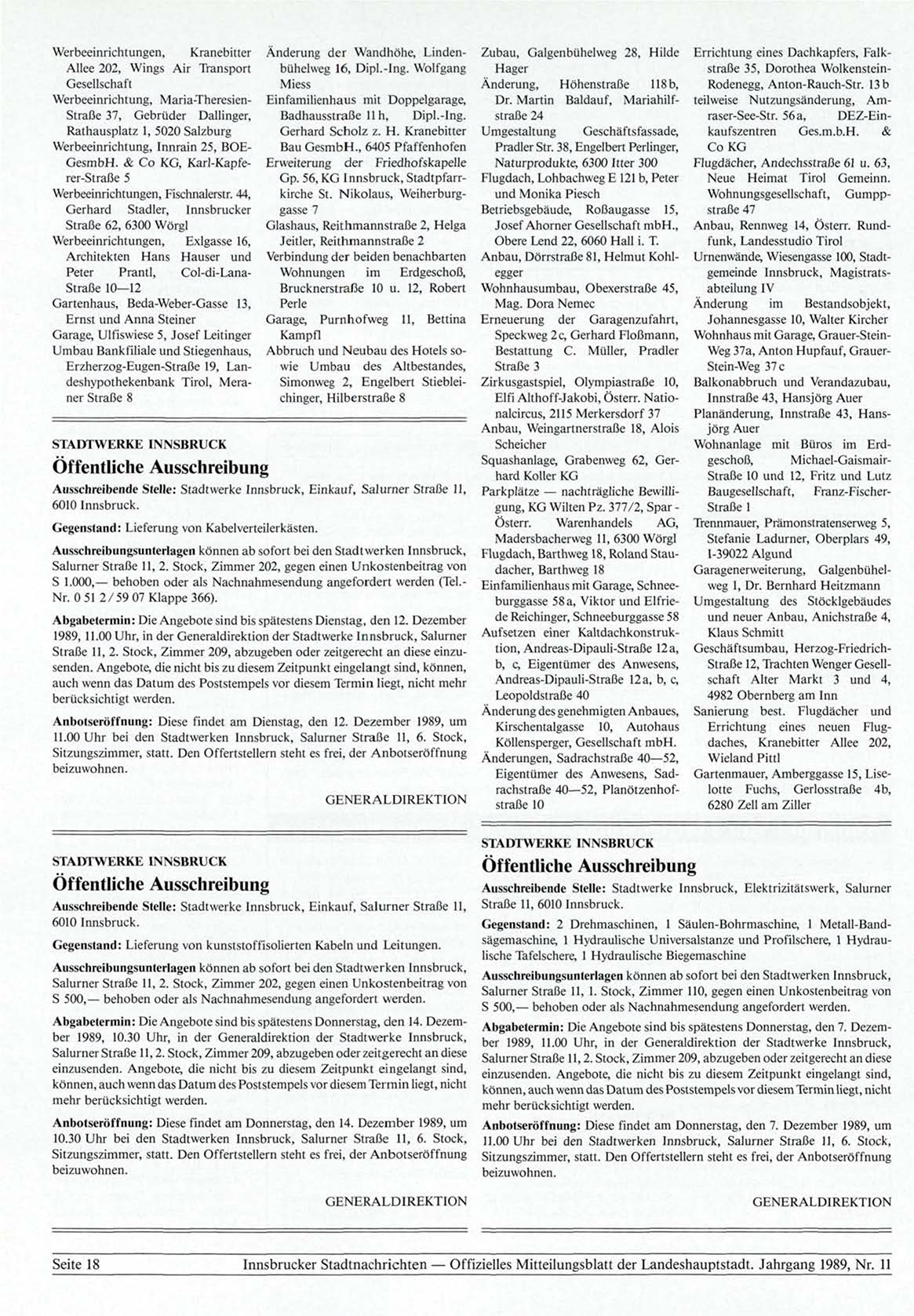 Abgabetermin: Die Angebote sind bis spätestens Donnerstag, den 7. Dezember 1989, 11.00 Uhr, in der Generaldirektion der Stadtwerke Innsbruck,