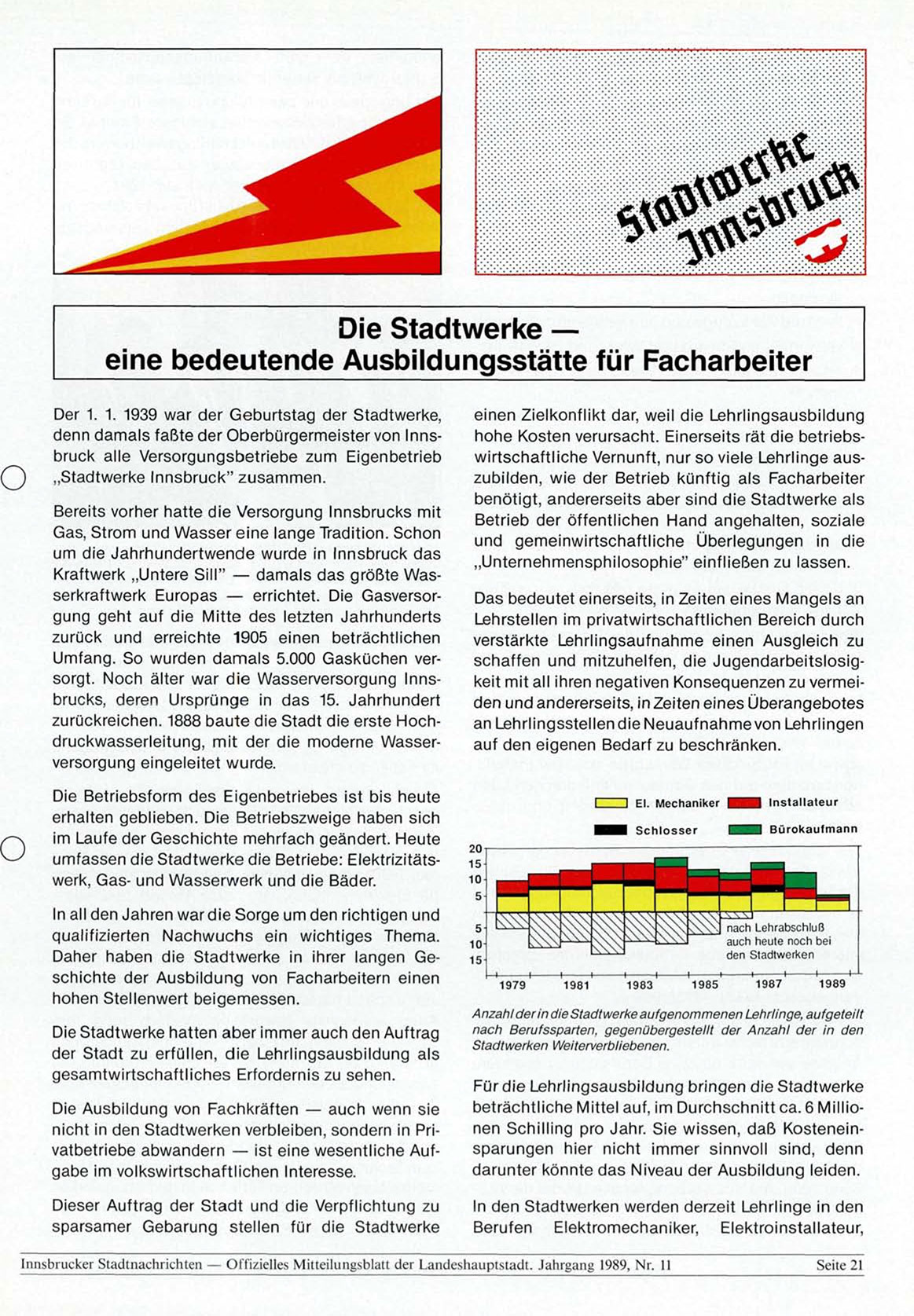 Innsbrucker Stadtnachrichten — Offizielles Mitteilungsblatt der Landeshauptstadt. Jahrgang 1989, Nr. 11