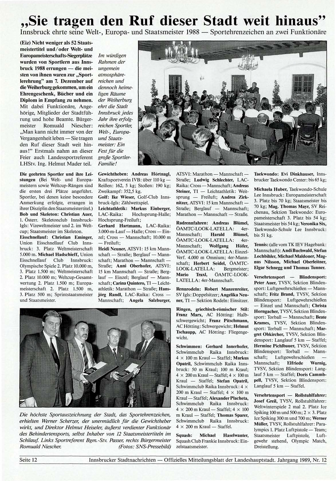 Innsbrucker Stadtnachrichten — Offizielles Mitteilungsblatt der Landeshauptstadt. Jahrgang 1989, Nr. 12