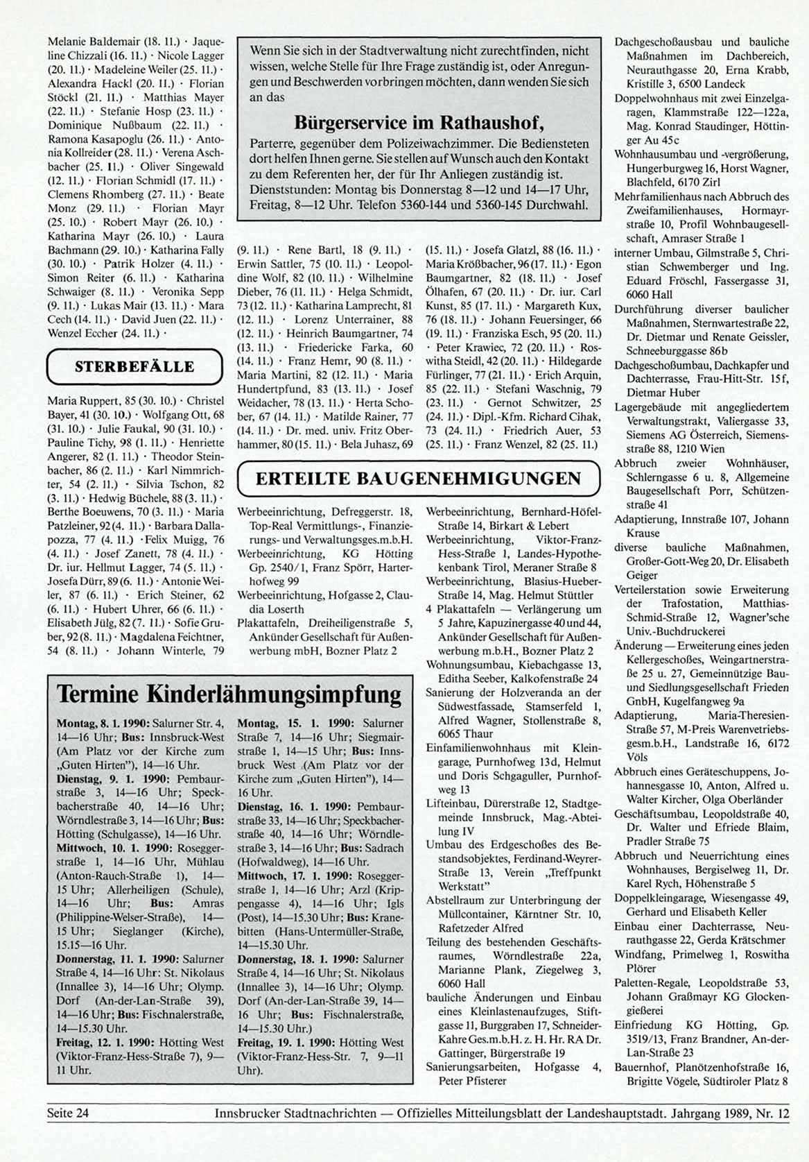 Innsbrucker Stadtnachrichten — Offizielles Mitteilungsblatt der Landeshauptstadt. Jahrgang 1989, Nr. 12