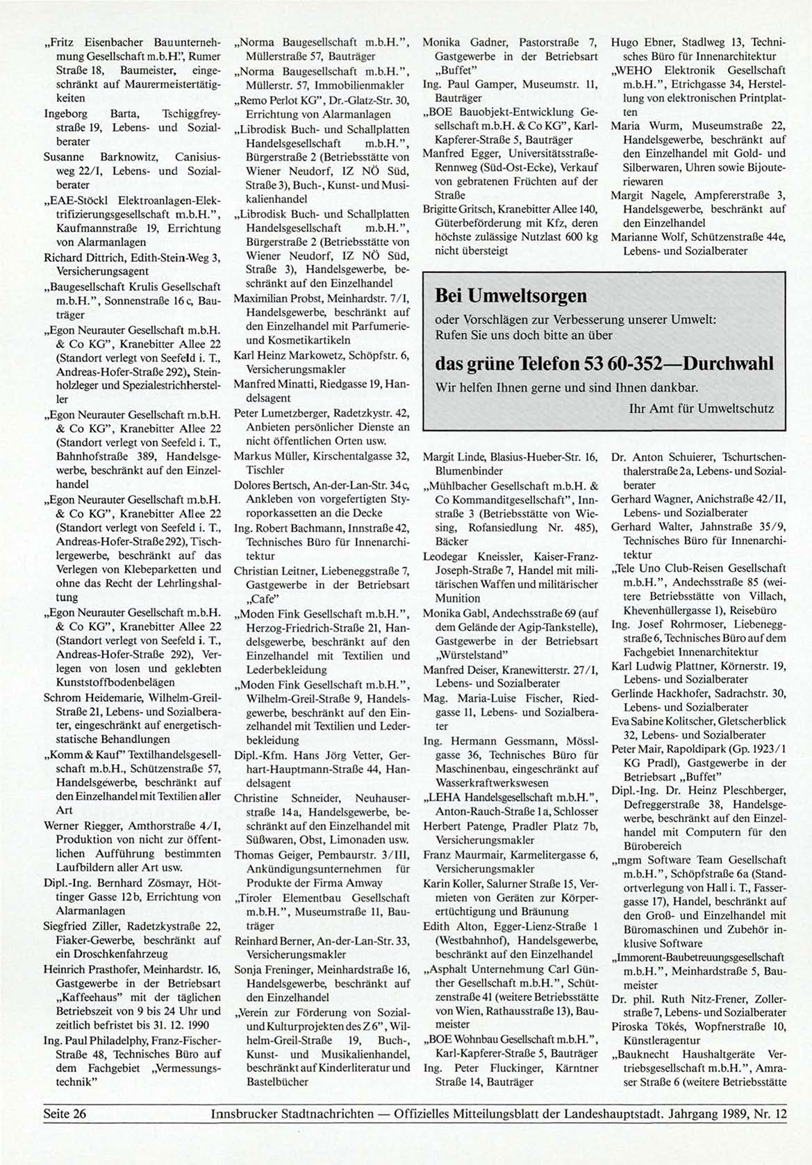 Innsbrucker Stadtnachrichten — Offizielles Mitteilungsblatt der Landeshauptstadt. Jahrgang 1989, Nr. 12