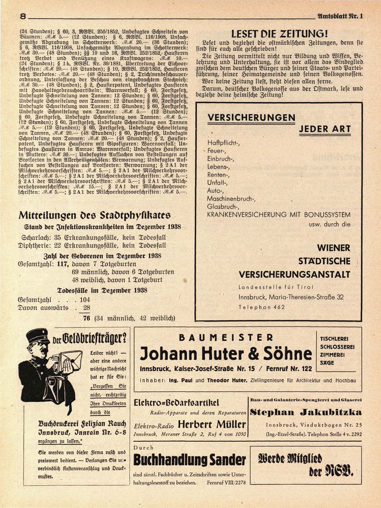 Schneitelung von Tannen: ^8°^ 20.— (48 Stunden); § 2, Hausierpatent, Unbefugtes Hausieren mit Gipsfiguren: Warenverfall: Unbefugtes Hausieren in Amras: Warenverfall; Unbefugtes Hausieren