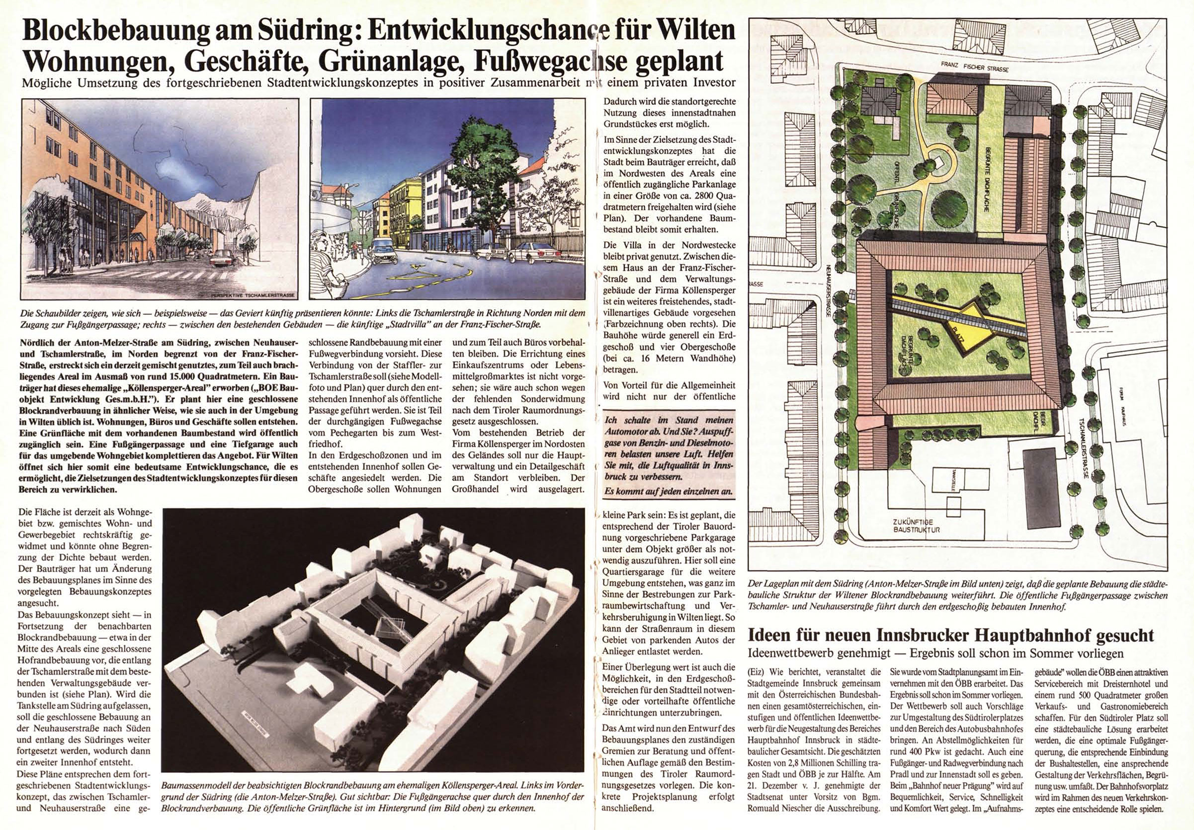 Diese Pläne entsprechen dem fortgeschriebenen Stadtentwicklungs- Baumassenmodell der beabsichtigten Blockrandbebauung am ehemaligen Köllensperger-Areal. Links im Vorderkonzept, das zwischen Tschamler- grund der Südring (die Anton-Melzer-Straße). Gut sichtbar: Die Fußgängerachse quer durch den Innenhof der