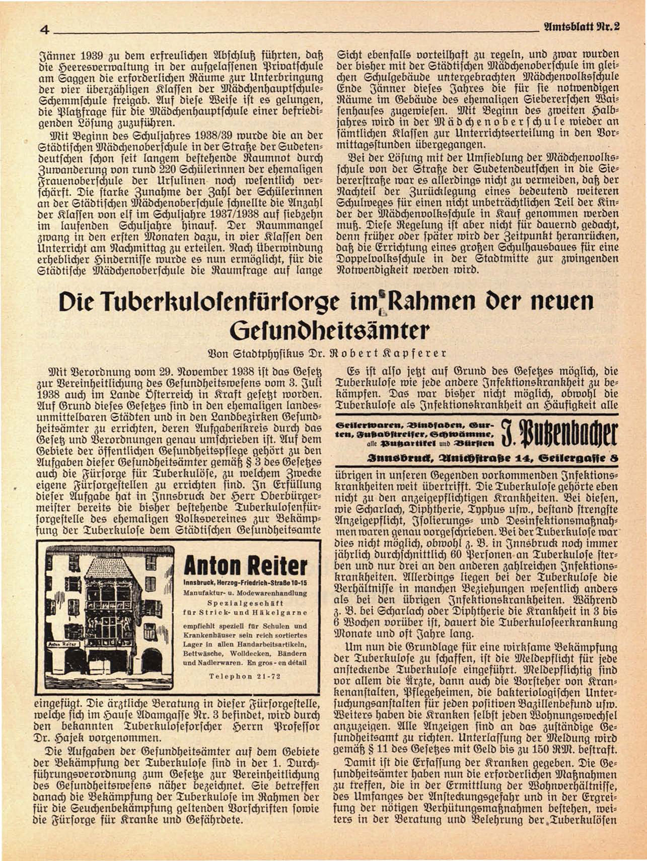 dieser Aufgabe hat in Innsbruck der Herr Oberbürgermeister bereits die bisher bestehende Tuberkulosenfürorgestelle des ehemaligen Volksvereines zur Bekämpung der Tuberkulose dem Städtischen Gesundheitsamte