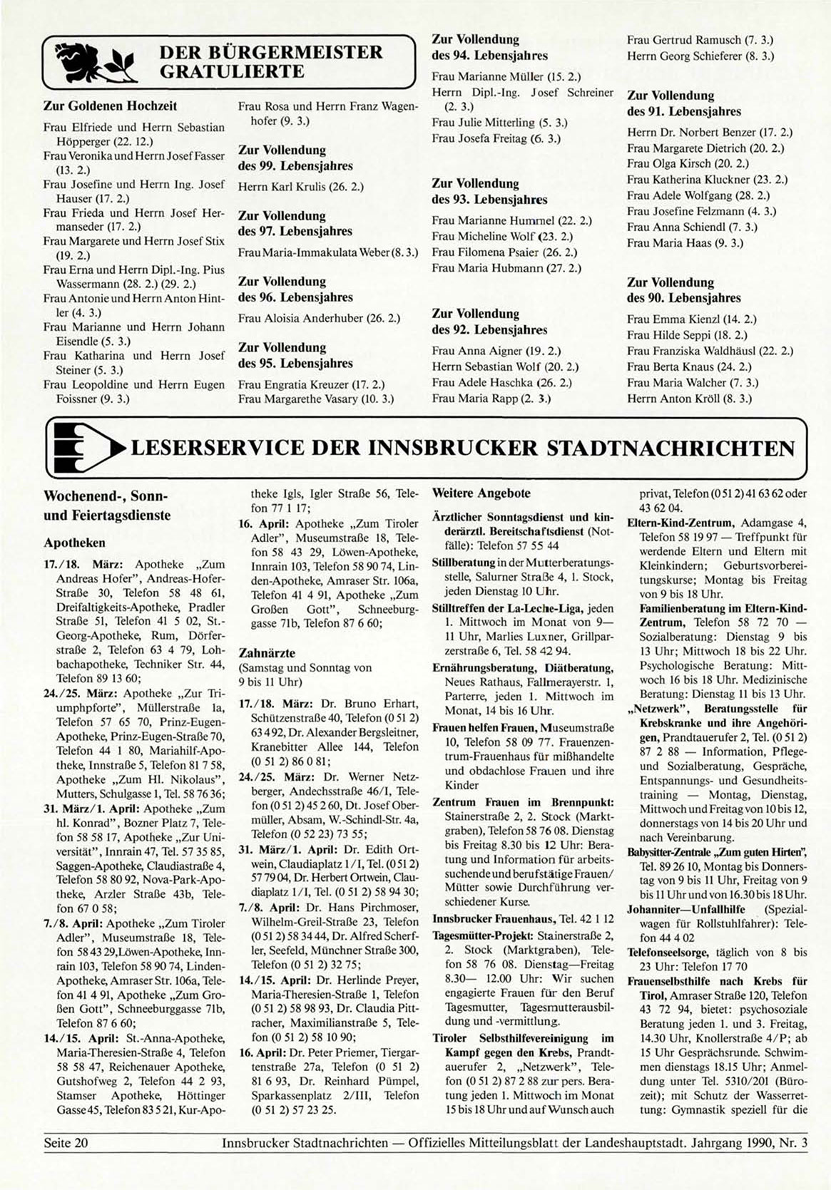 Innsbrucker Stadtnachrichten — Offizielles Mitteilungsblatt der Landeshauptstadt. Jahrgang 1990, Nr. 3
