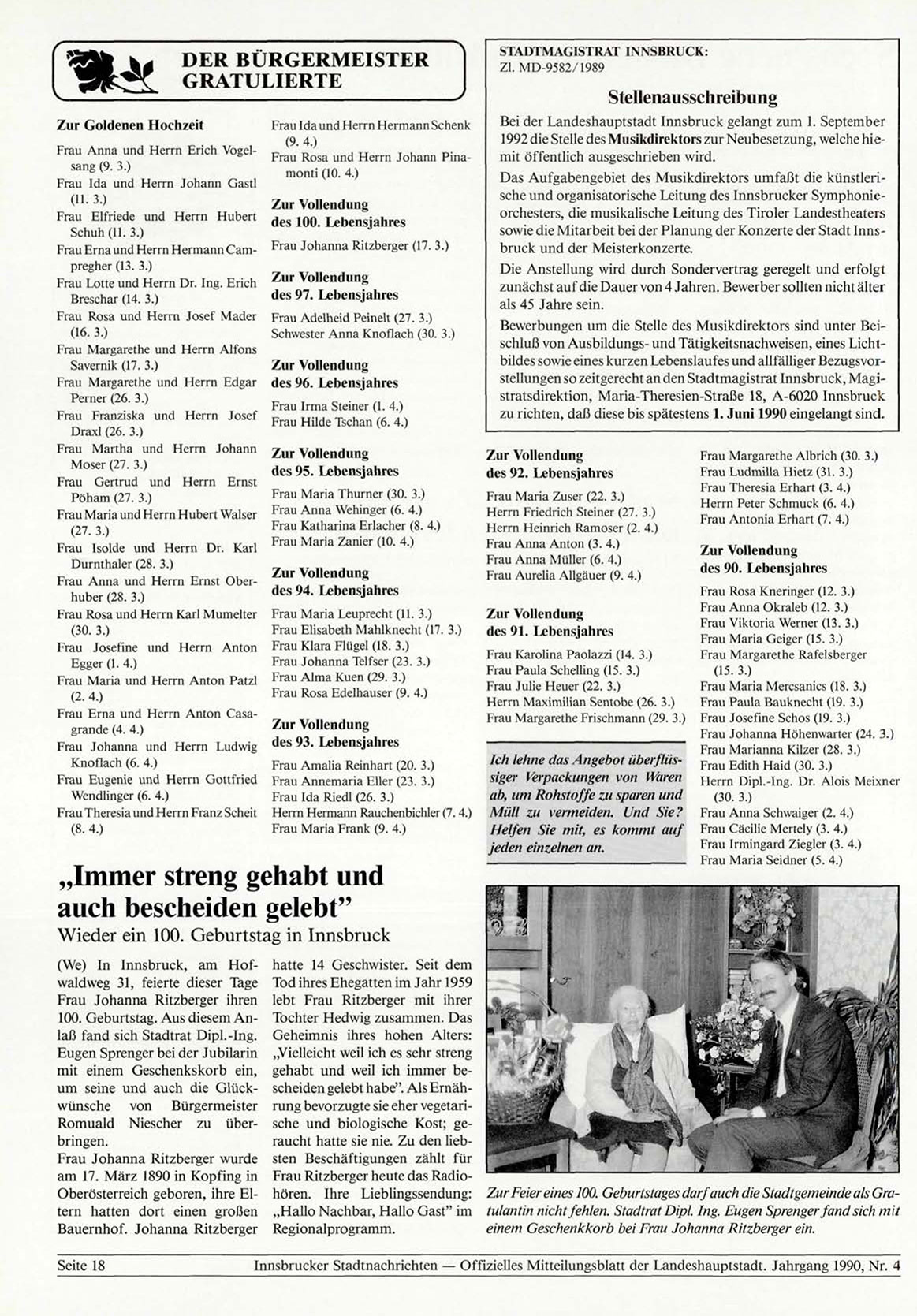 Innsbrucker Stadtnachrichten — Offizielles Mitteilungsblatt der Landeshauptstadt. Jahrgang 1990, Nr. 4