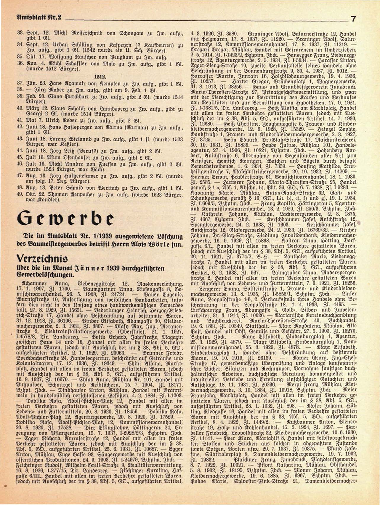 Gewerbetreibende. 1. 6. 1934. ZI. 7359. — Housing Mathilde, Dreiheiligenstraße 7, Maschinstrickergewerbe. 20. 10. 1932, ZI. 14209. —