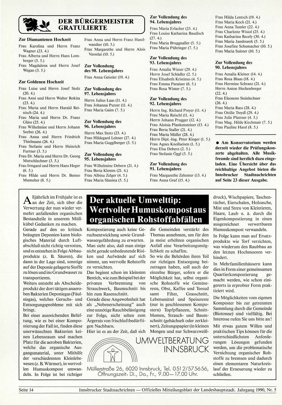 Innsbrucker Stadtnachrichten — Offizielles Mitteilungsblatt der Landeshauptstadt. Jahrgang 1990, Nr. 5