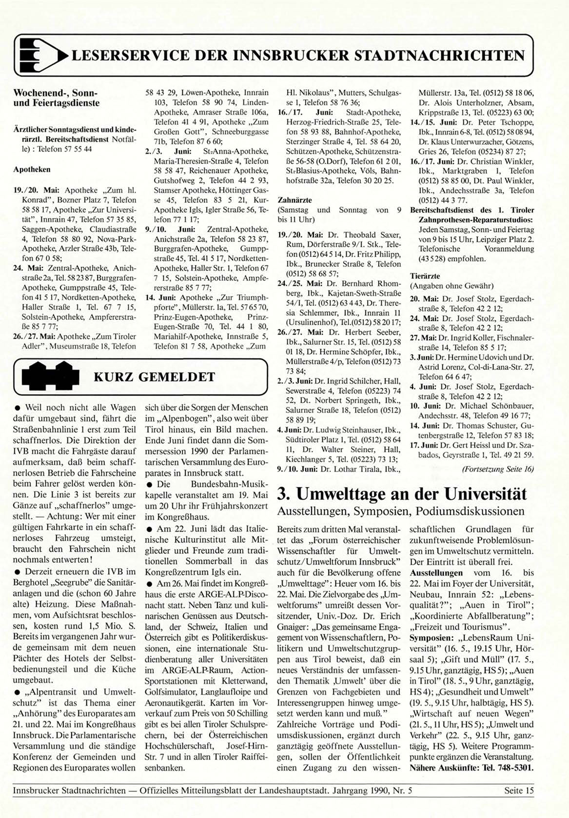 Innsbrucker Stadtnachrichten — Offizielles Mitteilungsblatt der Landeshauptstadt. Jahrgang 1990, Nr. 5